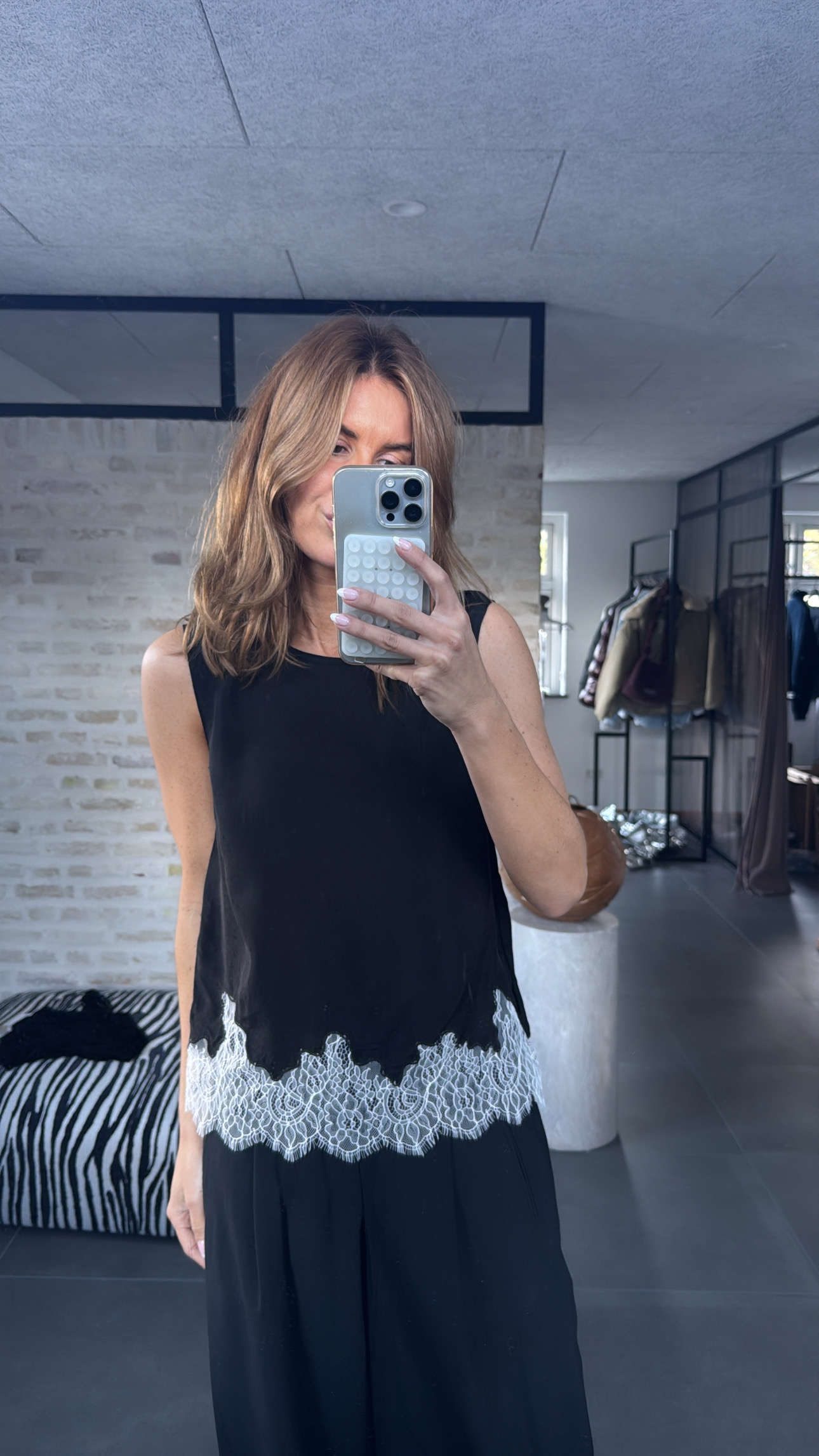 Toppen kommer i en tyng lingeri lignende kvalitet og har en smuk bred hvid blonde forneden.