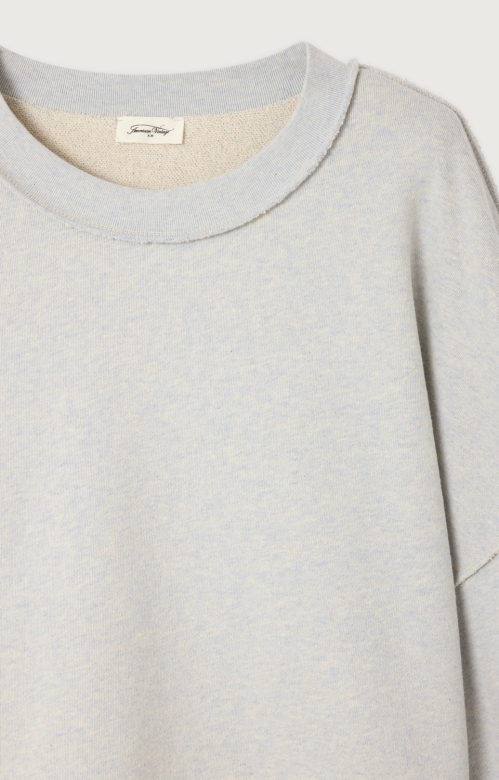 Sweatshirten har vide ærmer og rå kanter og kommer i den flotteste isblå meleret farve.