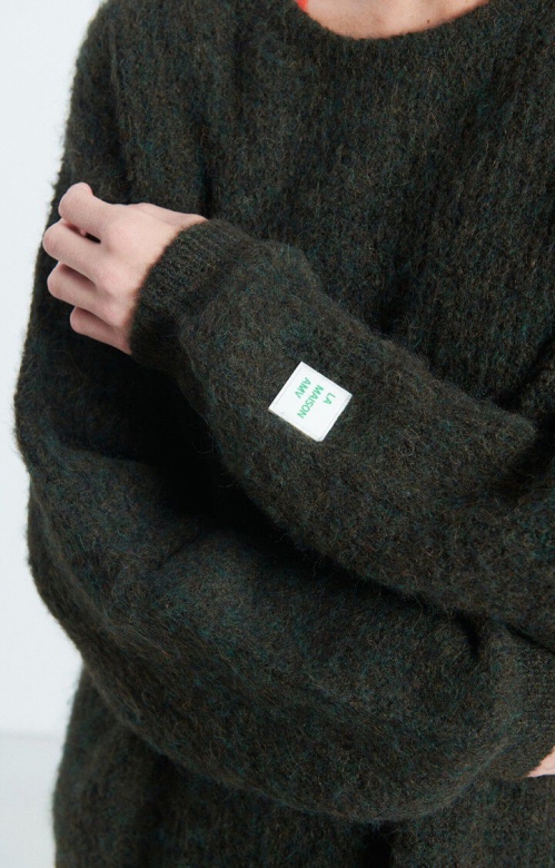 Denne strik har en løs pasform og kommer i den smukkeste brune nuance med en smule grøn meleret.