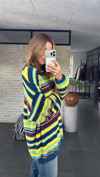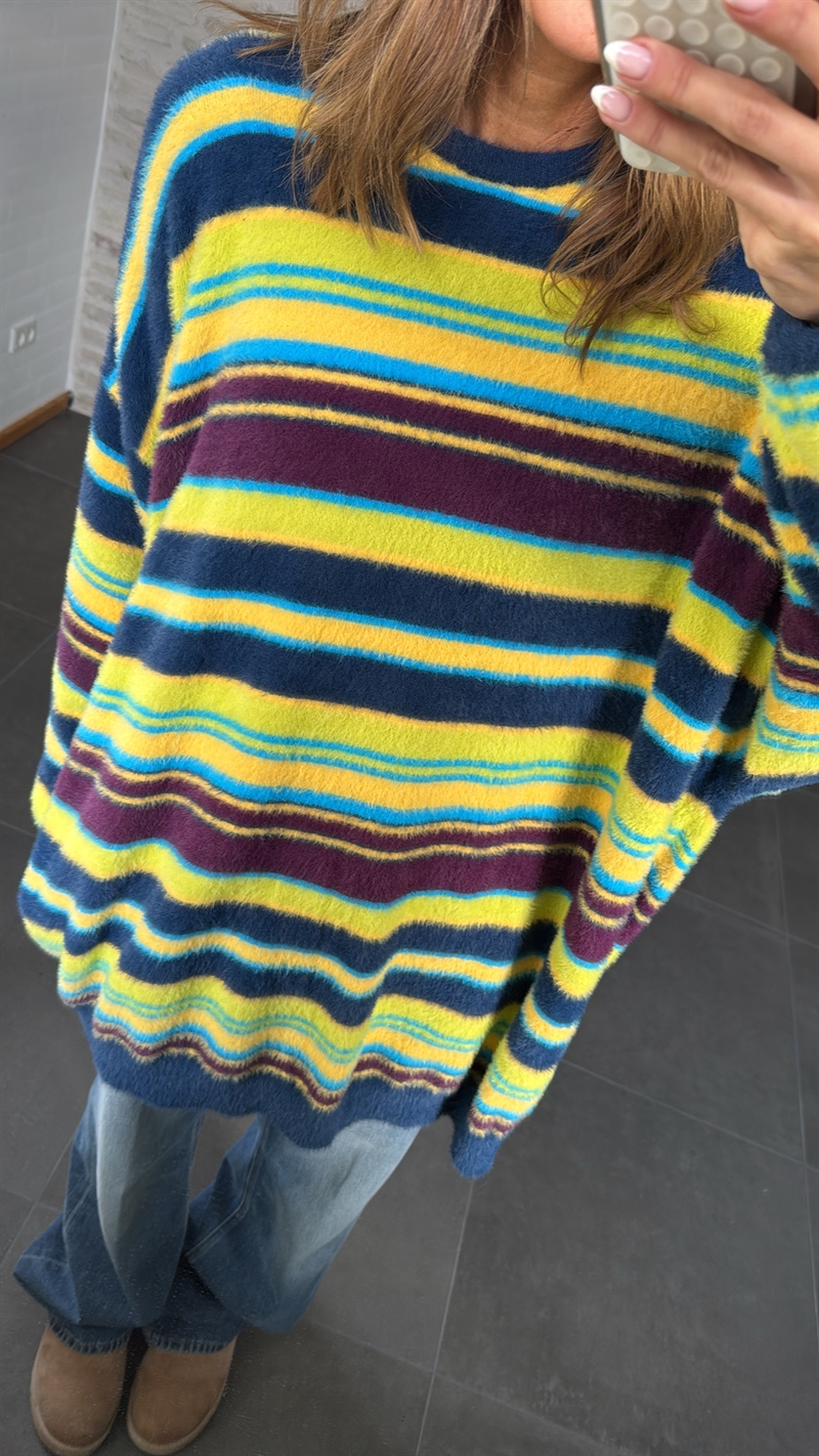 De multicolor striber tilfører et legende twist til det klassiske strikdesign, mens den løse pasform og runde hals gør den nem at style – både over en skjorte, kjole eller alene til et par jeans.