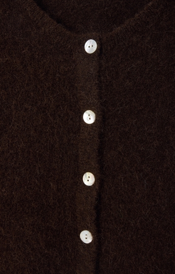 Cardigan fra American Vintage i den smukkeste mørkebrune nuance. Strikken har rund hals og perlemorsknapper hele vejen ned. Den perfekte cardigan til efteråret!