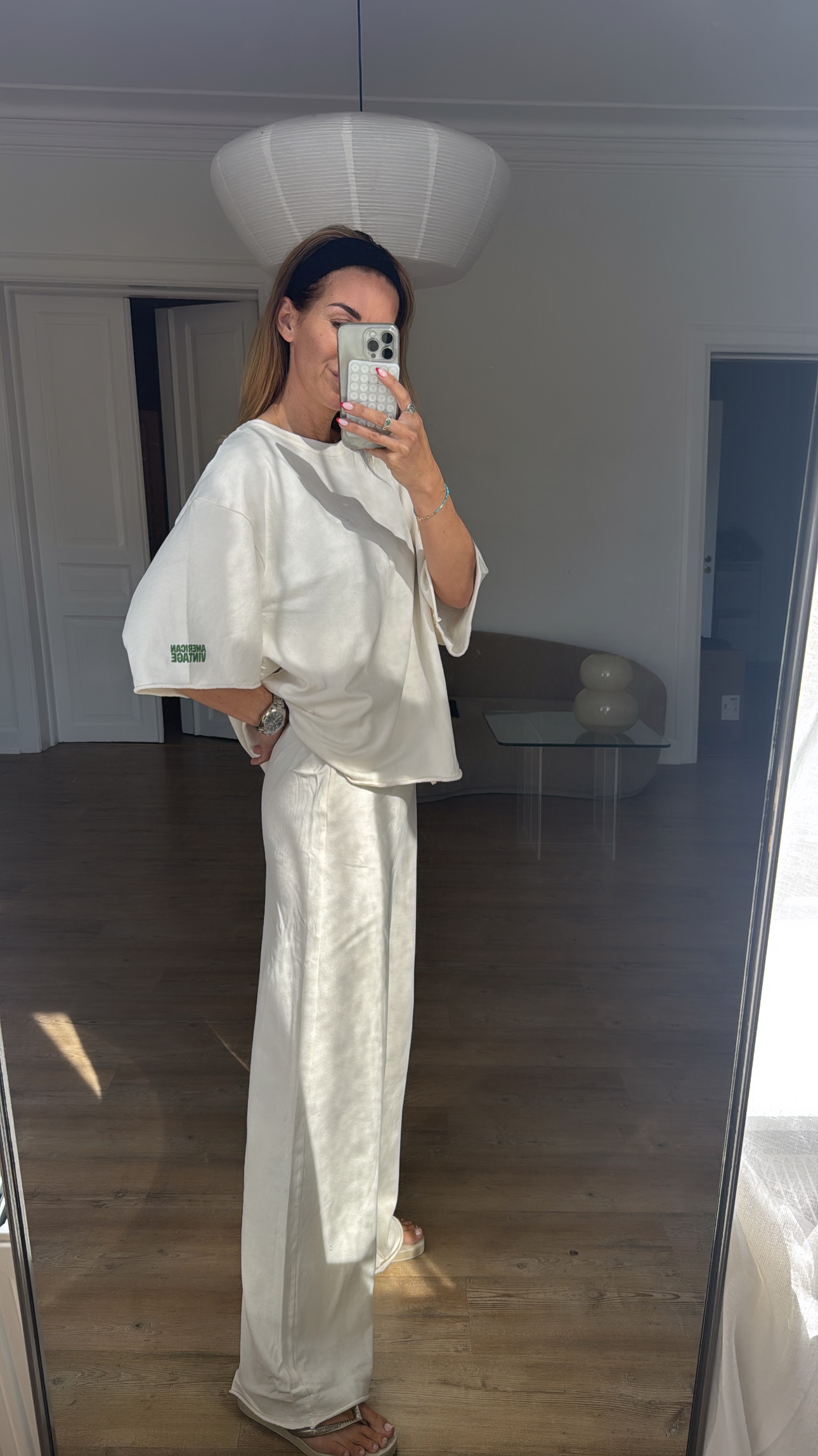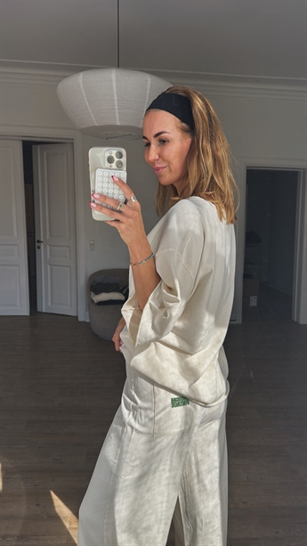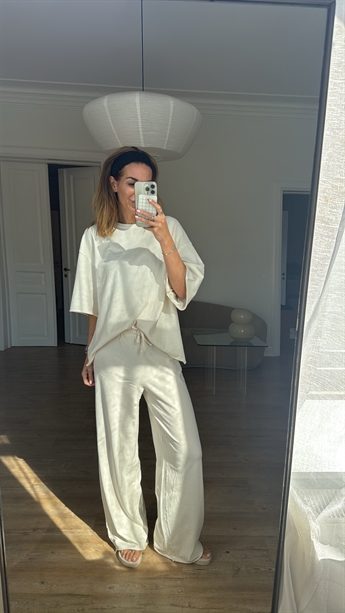 Er den LÆKRESTE BLØDE joggings fra Franske American Vintage! Den har et afslappet look og pasform og kommer i den her smukke off-white farve med oliven grøn American Vintage logo detalje bagpå lommen!