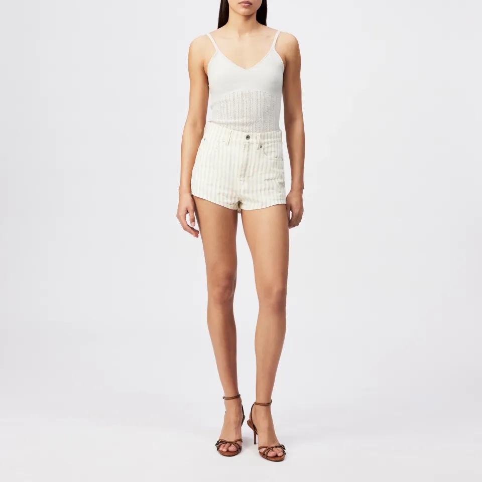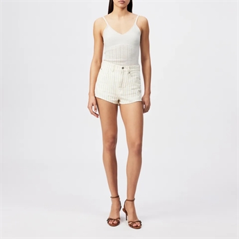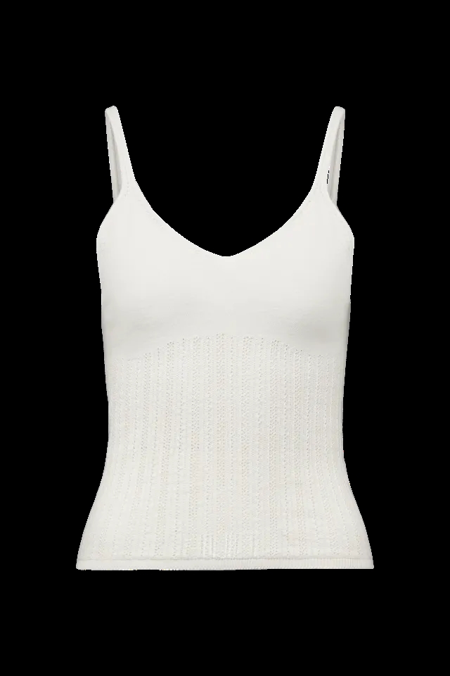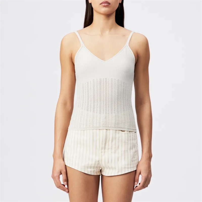 er en elegant striktop med spaghetti-stropper og V-udskæring, der er designet i en klassisk længde. Fremstillet i ren bomuld, imponerer den med et mat look og en tør fornemmelse, der giver en sommerlig følelse.