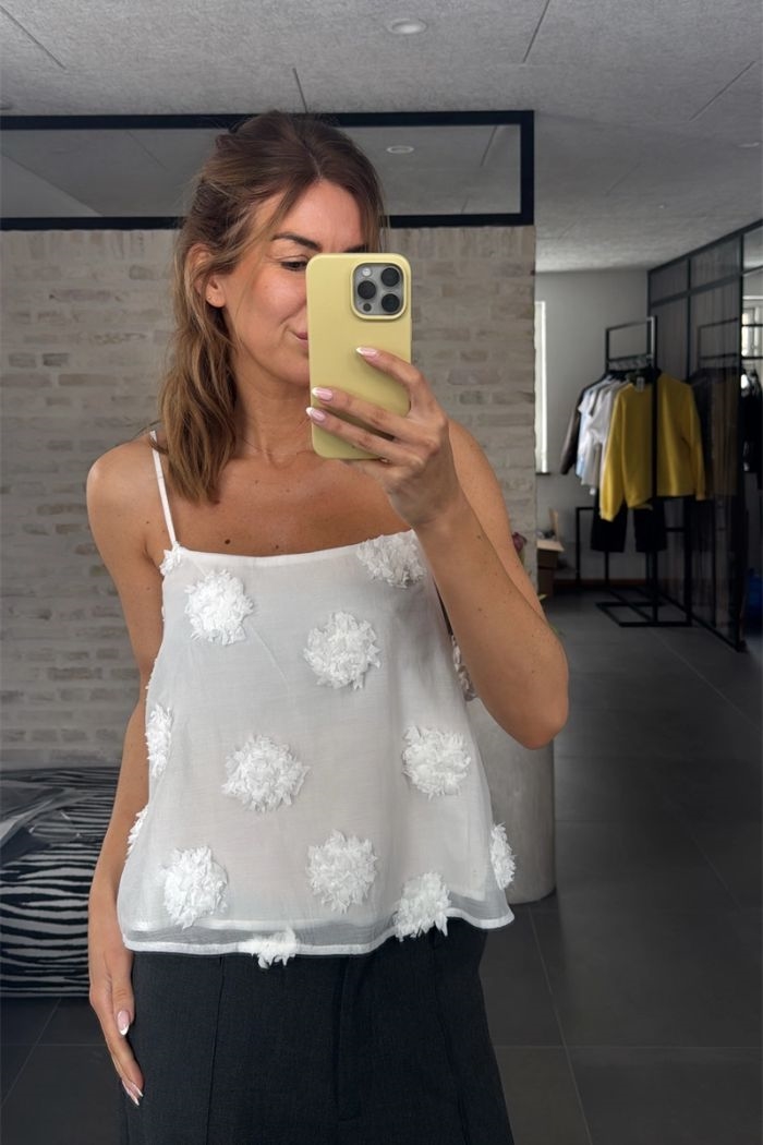 Smuk skulpturel organza top med 3D blomster struktur.