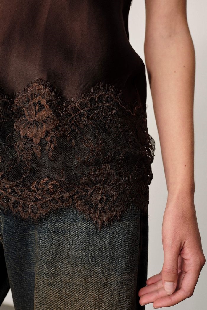 Herskinds signatur-lace top i et tidløst og elegant udtryk. Den glatte satin falder let og giver en feminin silhuet, mens de delikate blondekanter langs udskæring og søm tilfører et luksuriøst touch.