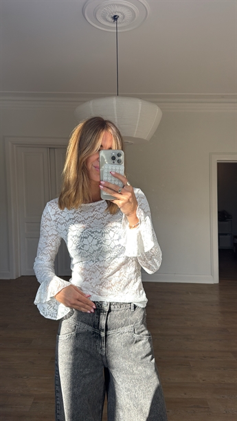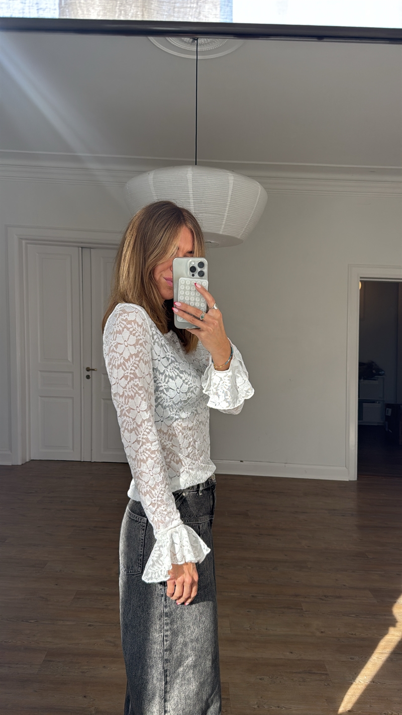 Smukkeste blonde top med skønt ærme med flæse detalje forneden.