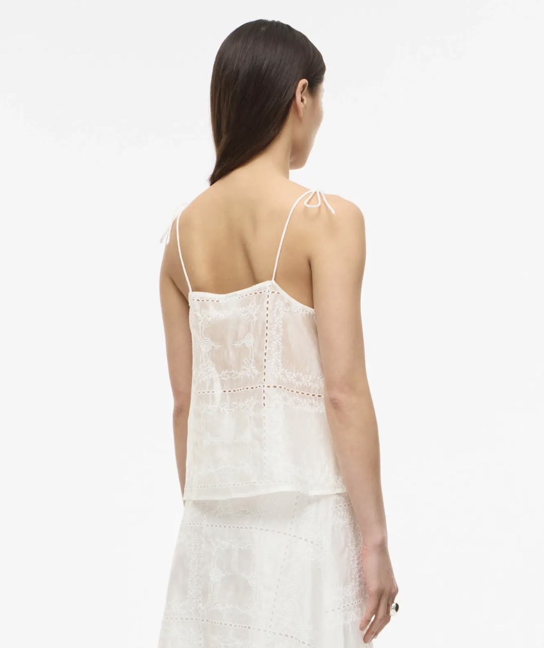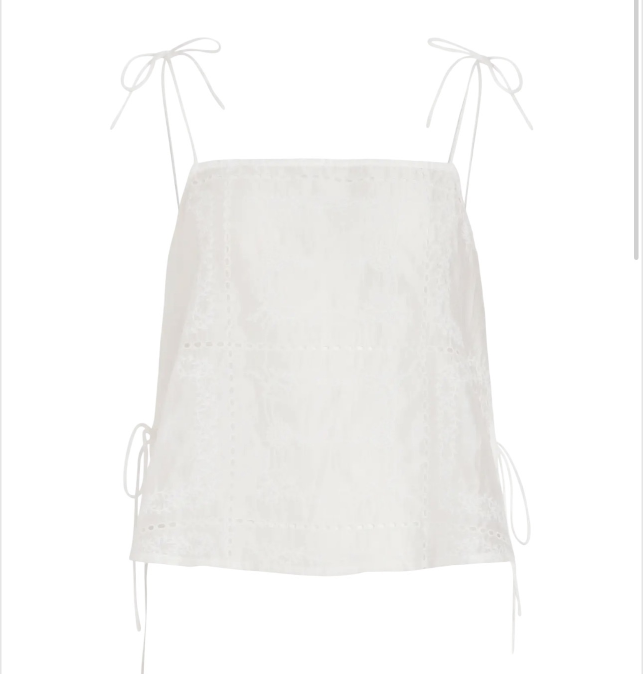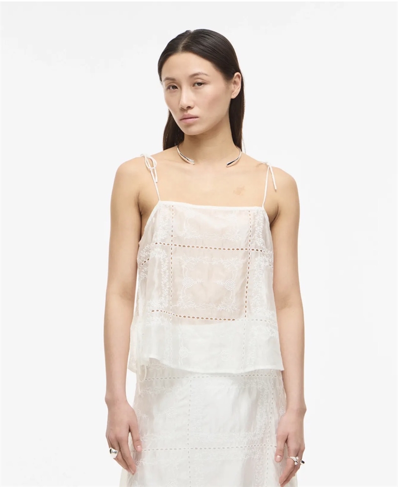 Smukkeste top i flot hvid nuance med smukke broderi detaljer og sløjfe-binde detaljer på stropperne og i siden af toppen, som giver det her lette og romatiske look - perfekt til sommer!